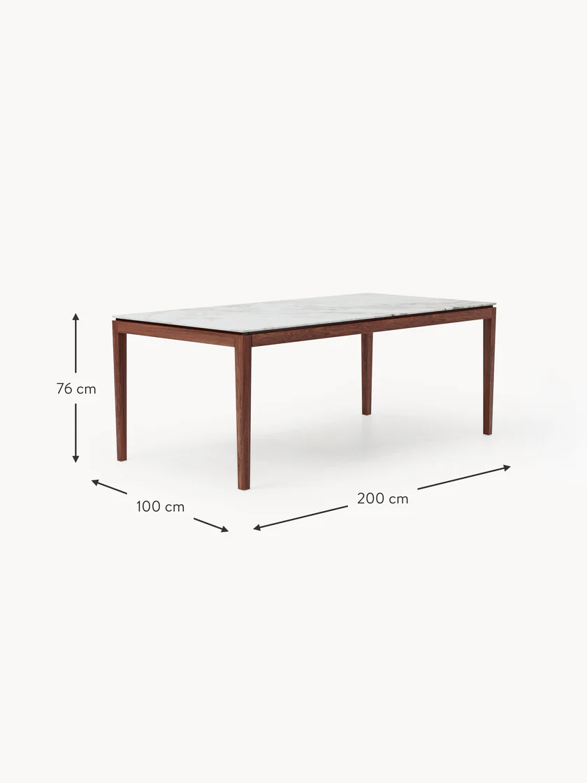 Deze klassieke houten eettafel krijgt een verfijnde en moderne twist dankzij het keramische tafelblad met luxe marmerlook. Het elegante contrast tussen het witte, glanzende blad en het donkere houten frame maakt deze tafel een echte blikvanger in elk interieur. Wat wij er zo bijzonder aan vinden? Hij combineert stijl met functionaliteit, met ruimte voor maar liefst acht personen – ideaal voor gezellige diners met familie of vrienden.