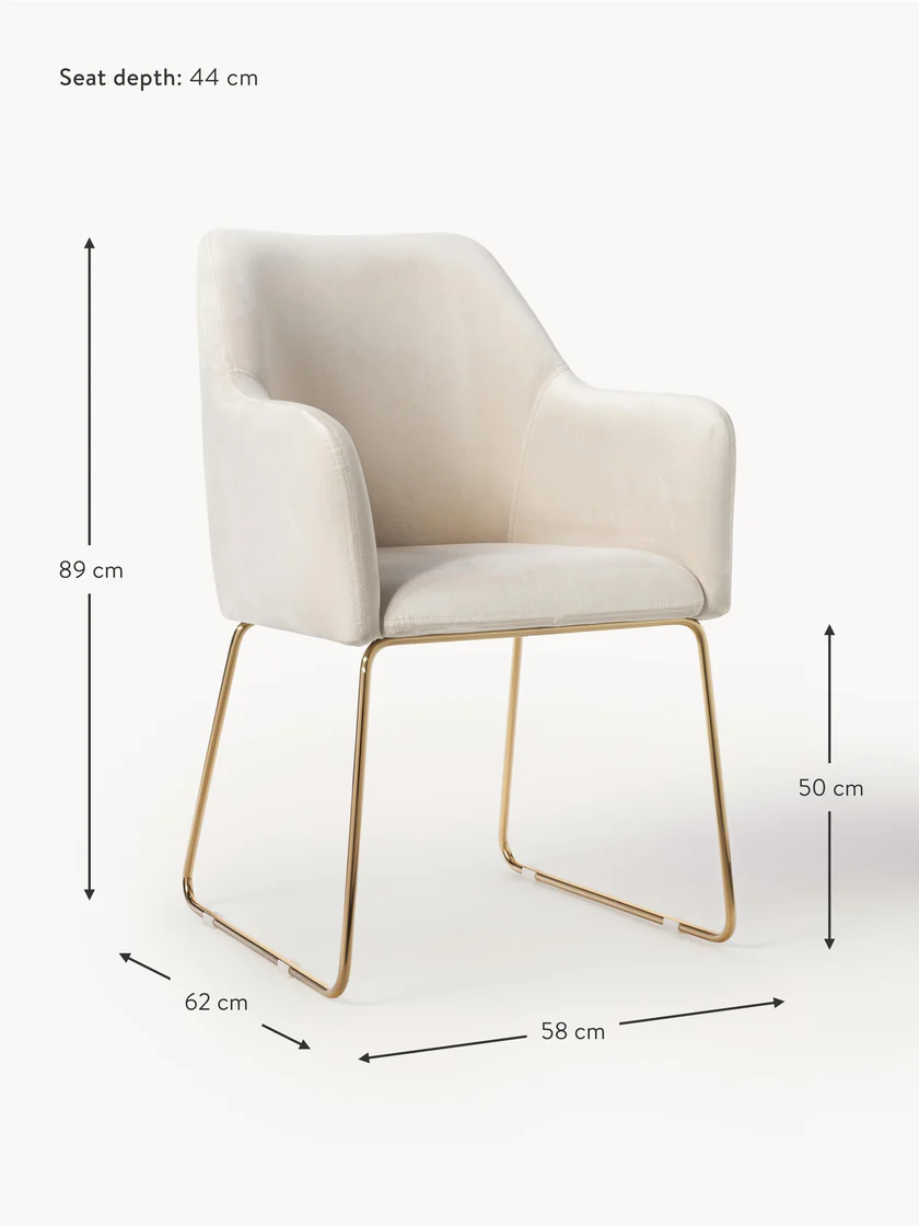 Geef je eetkamer of thuiskantoor een vleugje elegantie met deze fluwelen armstoel met goudkleurige poten. De zachte crème bekleding in combinatie met de slanke, glanzende metalen poten straalt luxe uit zonder in te leveren op comfort.